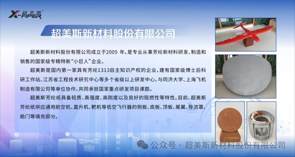 超美斯一直致力于芳纶材料的研发与创新,其产品在航空航天、无人机制造等多个领域展现出了卓越的性能与广泛的应用前景。此次参展,超美斯不仅带来了最新的科研成果,更展示了其在低空经济领域的前瞻布局与深厚实力,成为了展会上一道亮丽的风景线。